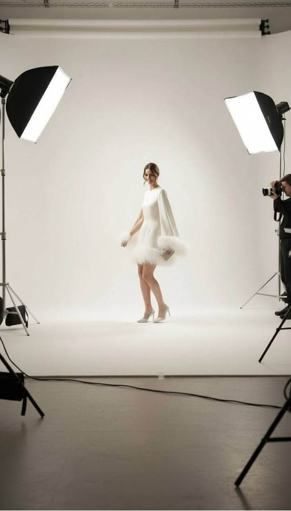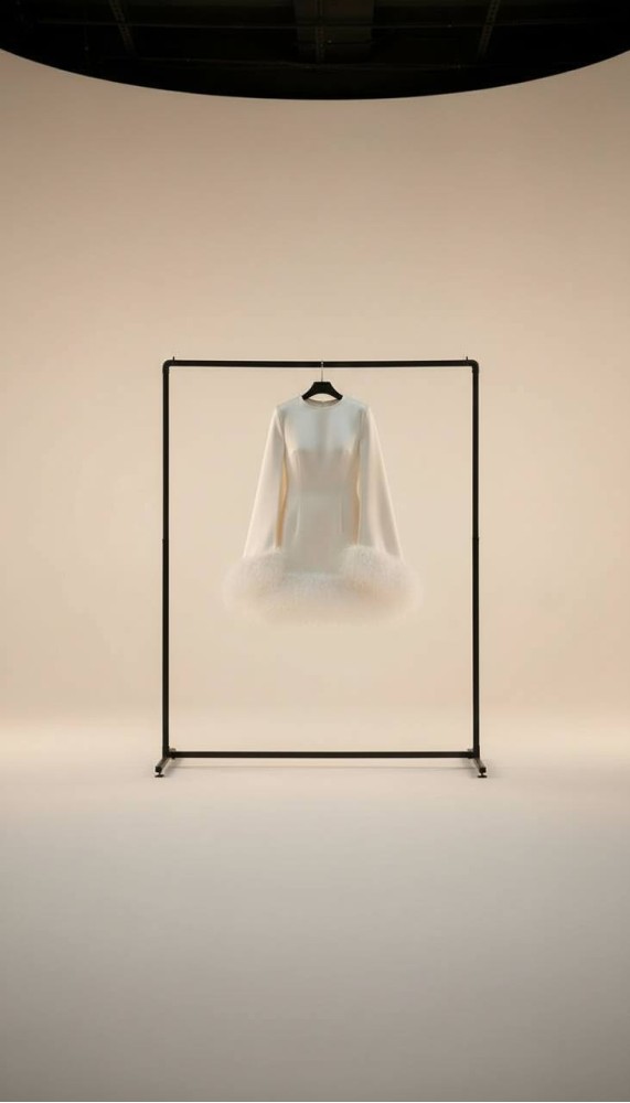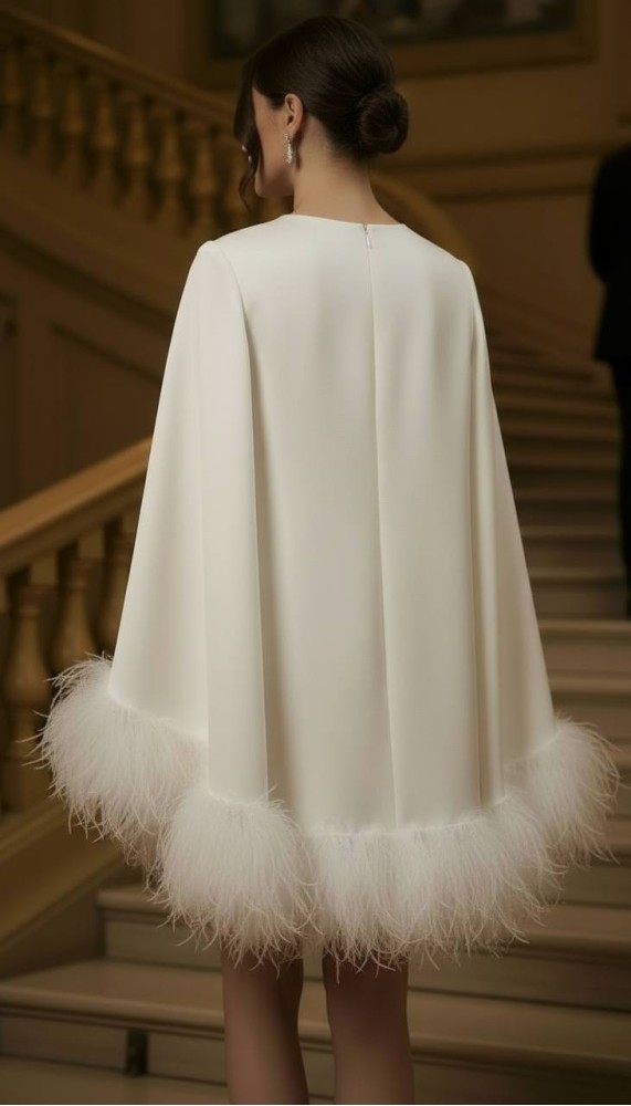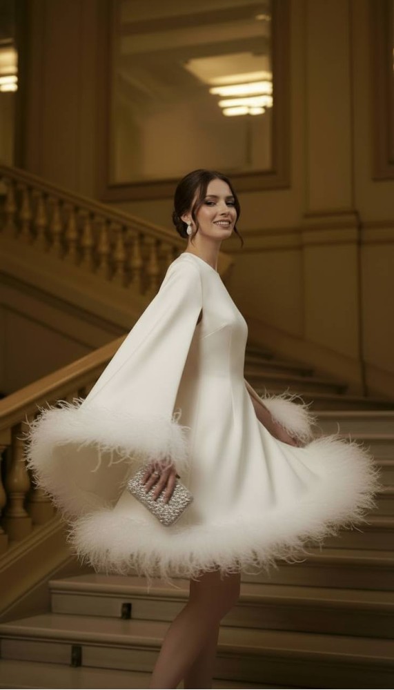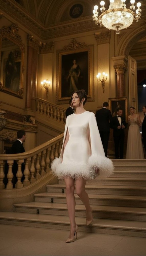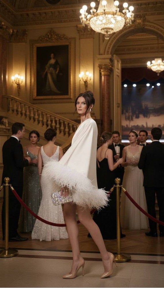 Длина мини визуально вытягивает ноги, а лаконичный верх делает образ благородно‑сдержанным и по‑настоящему люксовым. Это белое платье с перьями станет главным акцентом вечера